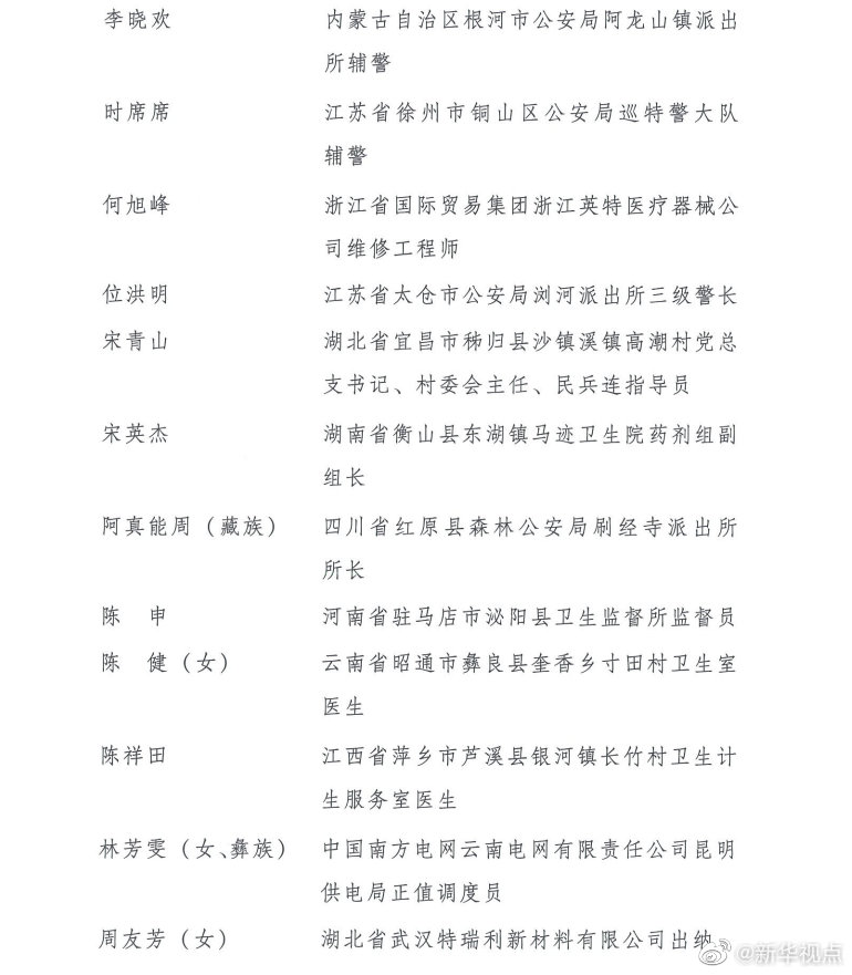 第24屆“中國青年五四獎?wù)隆弊肥谌藛T分別是:廣東省職業(yè)病防治院職業(yè)衛(wèi)生評價所主管醫(yī)師王爍,陜西省扶風(fēng)恒盛科技生態(tài)農(nóng)業(yè)農(nóng)民專業(yè)合作社員工王輝,黑龍江省齊齊哈爾市公安局鐵鋒分局新工地派出所代理副所長、四級警長王春天,湖南省邵東市公安局水東江鎮(zhèn)派出所輔警王調(diào)兵,江蘇省蘇州阿美咔嘰文化傳播有限公司總經(jīng)理、蘇州藍(lán)天救援隊(duì)隊(duì)員兼江蘇機(jī)動隊(duì)隊(duì)長許鵬,山東省泰安市公安局泰山分局網(wǎng)絡(luò)安全保衛(wèi)大隊(duì)偵查中隊(duì)指導(dǎo)員李弦,湖北省武漢市中心醫(yī)院眼科主治醫(yī)師李文亮(滿族),云南省南澗縣樂秋鄉(xiāng)國土和村鎮(zhèn)規(guī)劃建設(shè)服務(wù)中心職員李光劍(彝族),山東省德州市陵城區(qū)徽王莊鎮(zhèn)徽王管區(qū)書記李洪明,內(nèi)蒙古自治區(qū)根河市公安局阿龍山鎮(zhèn)派出所輔警李曉歡,江蘇省徐州市銅山區(qū)公安局巡特警大隊(duì)輔警時席席,浙江省國際貿(mào)易集團(tuán)浙江英特醫(yī)療器械公司維修工程師何旭峰,江蘇省太倉市公安局瀏河派出所三級警長位洪明,湖北省宜昌市秭歸縣沙鎮(zhèn)溪鎮(zhèn)高潮村黨總支書記、村委會主任、民兵連指導(dǎo)員宋青山,湖南省衡山縣東湖鎮(zhèn)馬跡衛(wèi)生院藥劑組副組長宋英杰,四川省紅原縣森林公安局刷經(jīng)寺派出所所長阿真能周(藏族),河南省駐馬店市泌陽縣衛(wèi)生監(jiān)督所監(jiān)督員陳申,云南省昭通市彝良縣奎香鄉(xiāng)寸田村衛(wèi)生室醫(yī)生陳?。ㄅ?,江西省萍鄉(xiāng)市蘆溪縣銀河鎮(zhèn)長竹村衛(wèi)生計(jì)生服務(wù)室醫(yī)生陳祥田,中國南方電網(wǎng)云南電網(wǎng)有限責(zé)任公司昆明供電局正值調(diào)度員林芳雯(女、彝族),湖北省武漢特瑞利新材料有限公司出納周友芳(女),安徽省銅陵市樅陽縣公安局特(巡)警大隊(duì)輔警一中隊(duì)副隊(duì)長胡鋒,四川省甘孜藏族自治州得榮縣龍絨寺寺廟管理委員會主任洛絨益西(藏族),四川省廣元經(jīng)開區(qū)盤龍鎮(zhèn)深溝村村民宮高明,江蘇省南京市公安局高淳分局淳溪派出所輔警袁劍雄,山東省泰安市岱岳區(qū)角峪鎮(zhèn)先鋒村村民賈慶臣,湖北省武漢市蔡甸區(qū)人民醫(yī)院住院醫(yī)師夏思思(女),江蘇省南京市公安局行政審批服務(wù)處網(wǎng)絡(luò)政務(wù)科一級警員徐昊,江蘇省徐州市沛縣公安局五段派出所輔警章良志,湖北省武漢市江夏區(qū)第一人民醫(yī)院醫(yī)師彭銀華,廣東省英德市公安局橋頭派出所輔警曾文聰,江西省蓮花縣湖上鄉(xiāng)中心衛(wèi)生院醫(yī)生熊波,河南省鄭州市公安局東風(fēng)路分局治安管理服務(wù)大隊(duì)三中隊(duì)民警、四級警長樊樹鋒,甘肅省舟曲縣扶貧辦副主任張小娟(女、藏族)。