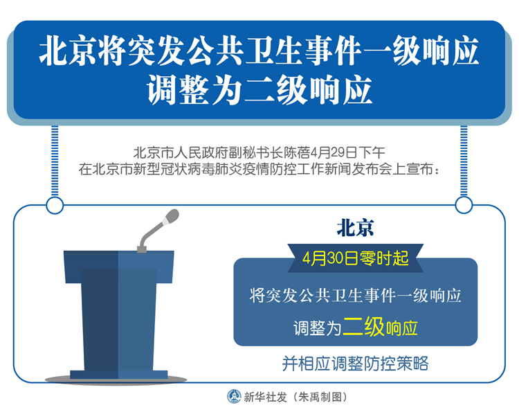 新華社北京4月29日電(記者關(guān)桂峰)北京市人民政府副秘書(shū)長(zhǎng)陳蓓29日下午在北京市新型冠狀病毒肺炎疫情防控工作新聞發(fā)布會(huì)上宣布:4月30日零時(shí)起,北京將突發(fā)公共衛(wèi)生事件一級(jí)響應(yīng)調(diào)整為二級(jí)響應(yīng),并相應(yīng)調(diào)整防控策略。