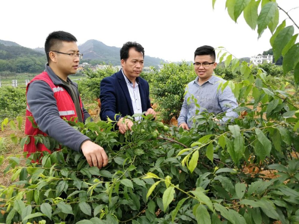 廣西馬山縣林圩鎮(zhèn)伏興村駐村第一書記周福波(左一)在查看村里已經(jīng)掛果的三華李(4月25日攝)。新華社記者 何偉 攝