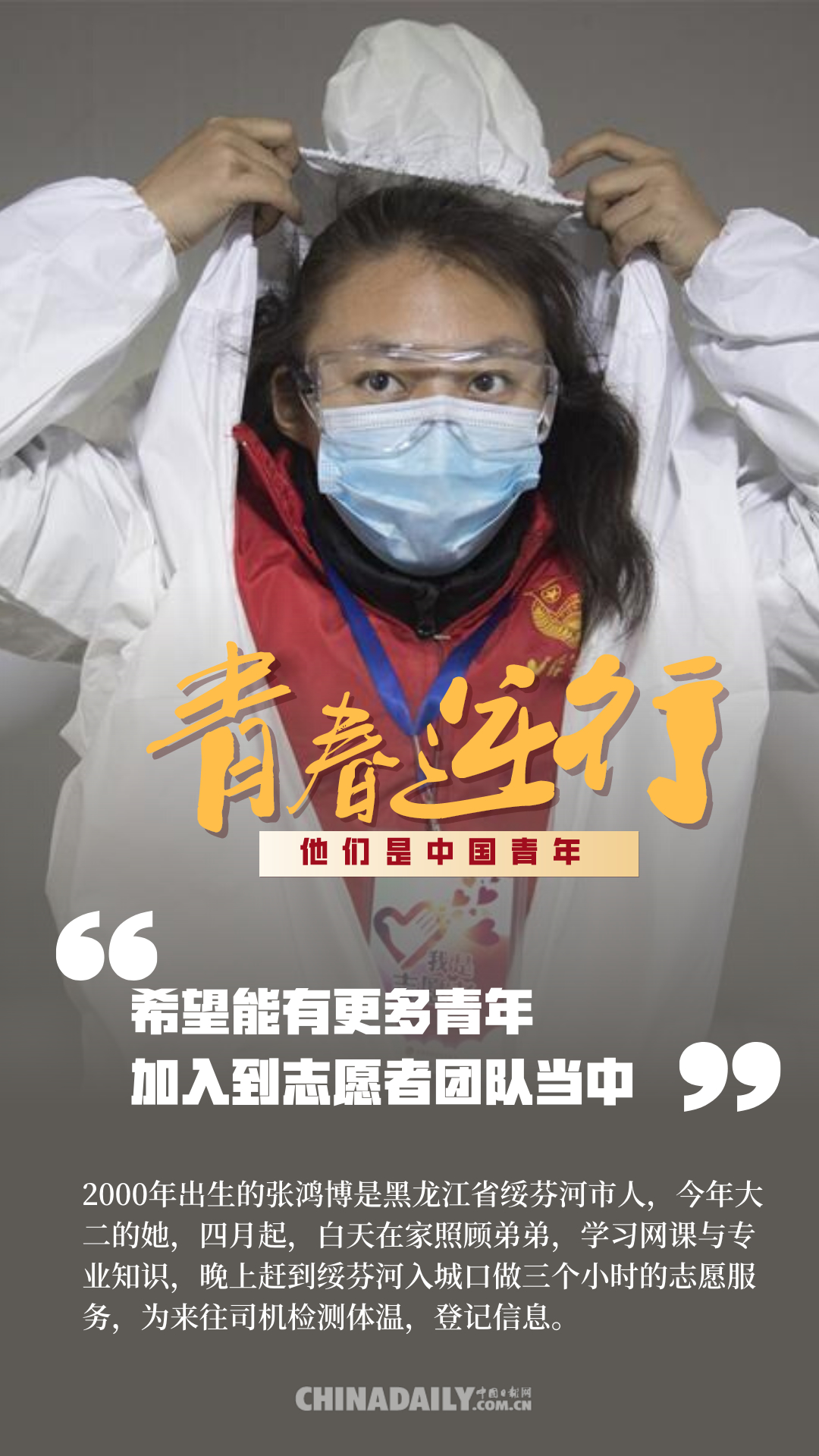 百年前,中國青年用春春和熱血,為祖國的前途命運(yùn)而抗?fàn)?;百年后,中國青年秉承先輩精神,沖鋒在保衛(wèi)人民健康安全的戰(zhàn)疫前線。危機(jī)之時(shí),他們總是挺身而出,主動(dòng)申請(qǐng)到國家和人民最需要的地方去。在這場疫情防控阻擊戰(zhàn)中,4.2萬多名援鄂醫(yī)護(hù)人員里有1.2萬多名“90后”,還有一部分是“95后”“00后”,此外,在基建工人、公安干警、志愿者、網(wǎng)格員等抗“疫”隊(duì)伍里也有許多年輕的面孔,他們?cè)谝咔榉揽刂猩嵘?、迎難而上,為我們筑起了一道道鋼鐵長城。這些人是當(dāng)代中國青年的縮影,他們用行動(dòng)證明,中國青年是堪當(dāng)大任的!