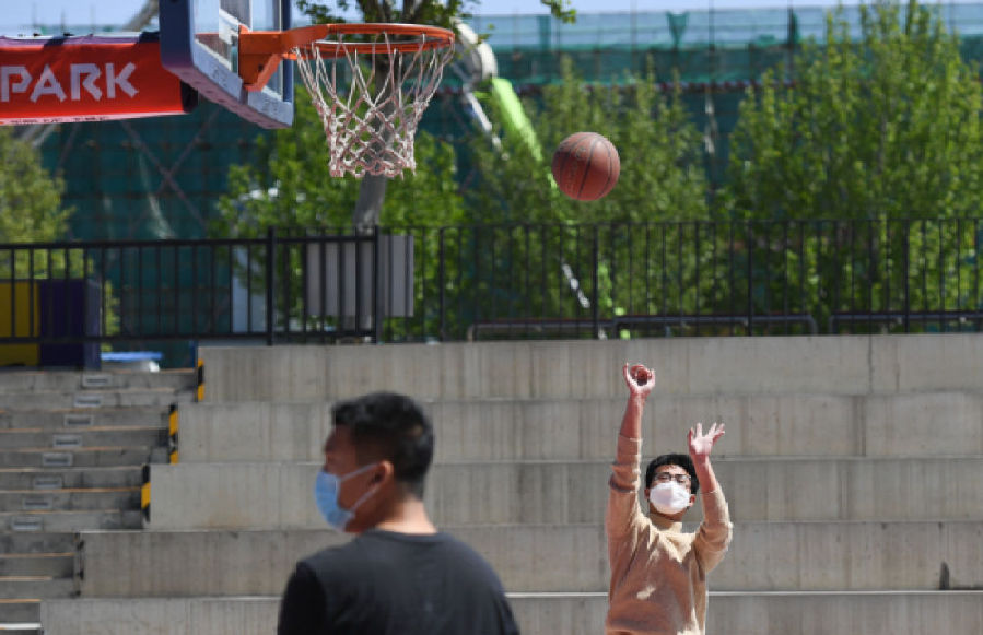 4月22日,市民通過(guò)實(shí)名預(yù)約場(chǎng)地,在北京市五棵松籃球公園室外球場(chǎng)打球 鞠煥宗/攝
