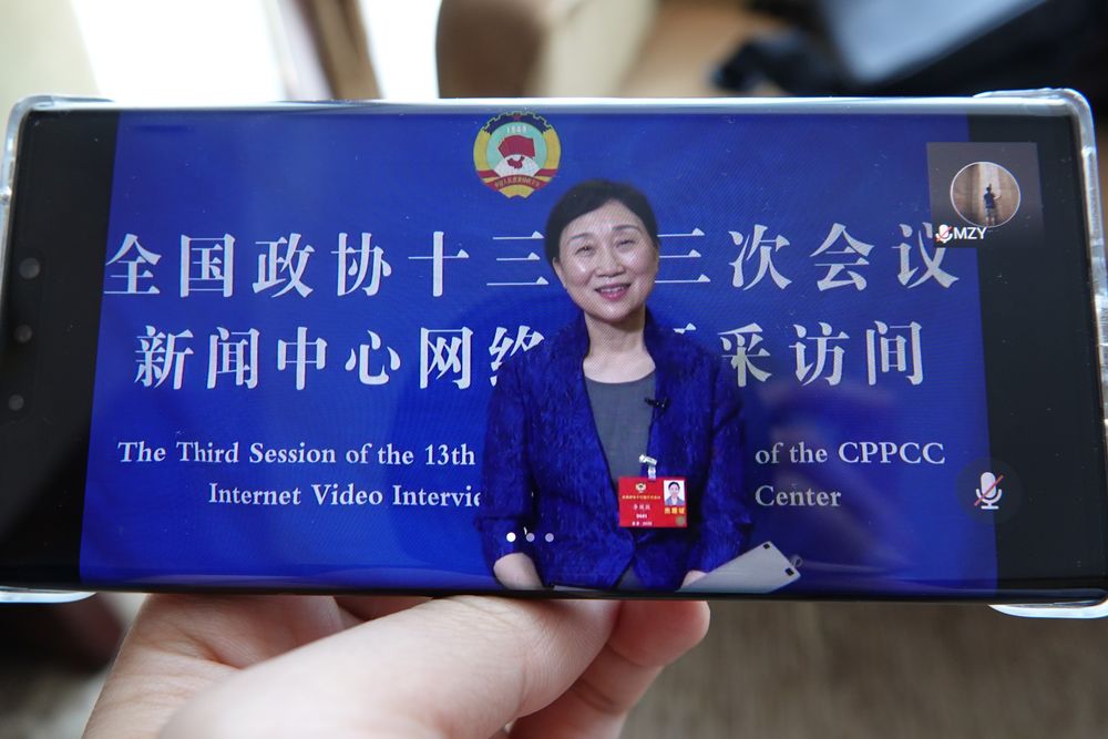 20日,記者通過手機觀看全國政協委員接受采訪。