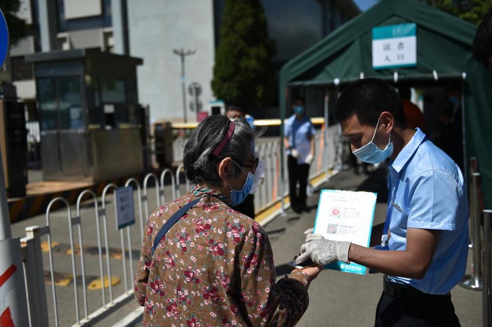 5月11日,在北京市海淀區(qū)的北京市十一學(xué)校龍樾實驗中學(xué),初三年級學(xué)生進入學(xué)校前掃描“健康碼”。新華社記者?任超?攝
