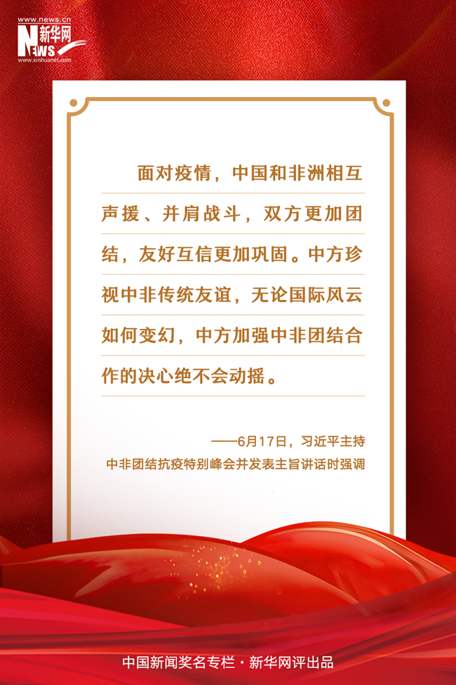 新老朋友通過視頻相聚,共商團結(jié)抗疫大計,共敘中非兄弟情誼。6月17日,由中國和非洲聯(lián)盟輪值主席國南非、中非合作論壇共同主席國塞內(nèi)加爾共同發(fā)起的中非團結(jié)抗疫特別峰會舉行。國家主席習近平在北京主持了這一峰會,并發(fā)表題為《團結(jié)抗疫 共克時艱》的主旨講話,強調(diào)中非要堅定不移攜手抗擊疫情、推進中非合作、踐行多邊主義、推進中非友好,共同打造中非衛(wèi)生健康共同體,推進中非全面戰(zhàn)略合作伙伴關(guān)系高水平發(fā)展。