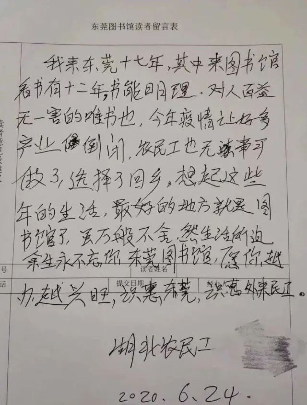 “我來東莞十七年,其中來圖書館看書有十二年。書能明理,對人百益無一害的唯書也。今年疫情讓好多產(chǎn)業(yè)(企業(yè))倒閉,農(nóng)民工也無事可做了,選擇了回鄉(xiāng)。想起這些年的生活,最好的地方就是圖書館了。雖萬般不舍,然生活所迫,余生永不忘你,東莞圖書館,愿你越辦越興旺。識惠東莞,識惠外來農(nóng)民工?!?/span>
