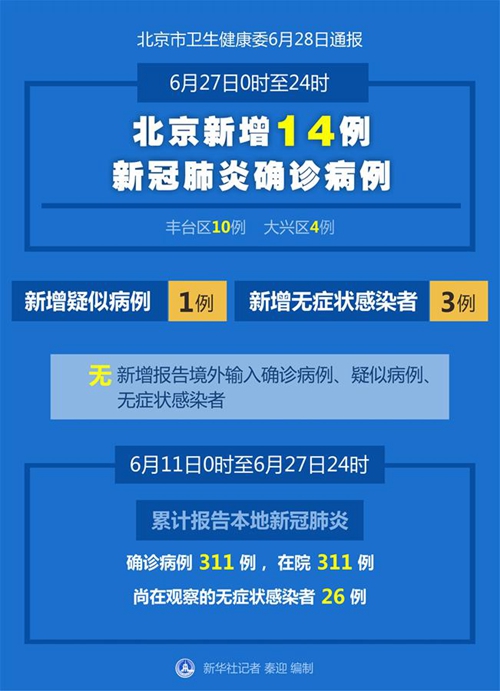 6月11日0時至6月27日24時,北京市累計報告本地新冠肺炎確診病例311例,在院311例,尚在觀察的無癥狀感染者26例。