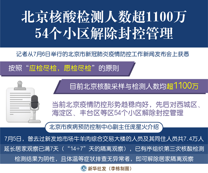 新華社北京7月6日電(記者關(guān)桂峰、田晨旭)記者從6日舉行的北京市新冠肺炎疫情防控工作新聞發(fā)布會上獲悉,按照“應(yīng)檢盡檢,愿檢盡檢”的原則,目前北京核酸采樣與檢測人數(shù)均超1100萬。當(dāng)前北京疫情防控形勢趨穩(wěn)向好,先后對西城區(qū)、海淀區(qū)、豐臺區(qū)等區(qū)54個小區(qū)解除封控管理。