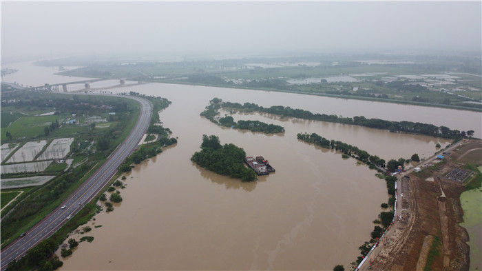 流經(jīng)安徽肥西縣三河鎮(zhèn)的河流水位猛漲(7月19日攝,無人機照片)。新華社記者 陳諾 攝