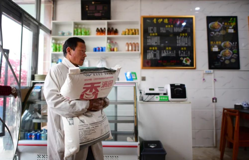 一名工人正在往一家牛肉面館配送面粉 張宏祥 攝