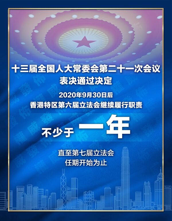 第十三屆全國人民代表大會常務(wù)委員會第二十一次會議審議了《國務(wù)院關(guān)于提請全國人民代表大會常務(wù)委員會就香港特別行政區(qū)第六屆立法會繼續(xù)運作作出決定的議案》。上述議案是應(yīng)香港特別行政區(qū)行政長官向中央人民政府報送的有關(guān)報告提出的。香港特別行政區(qū)行政長官會同行政會議因應(yīng)當(dāng)?shù)匦鹿诜窝滓咔榈膰?yán)峻形勢已決定將香港特別行政區(qū)第七屆立法會選舉推遲一年,在此情況下香港特別行政區(qū)立法機(jī)關(guān)將出現(xiàn)空缺。為維護(hù)香港特別行政區(qū)憲制秩序和法治秩序,確保香港特別行政區(qū)政府正常施政和社會正常運行,根據(jù)《中華人民共和國憲法》和《中華人民共和國香港特別行政區(qū)基本法》的有關(guān)規(guī)定,全國人民代表大會常務(wù)委員會作出如下決定: