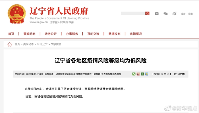 8月15日24時(shí),大連市甘井子區(qū)大連灣街道由高風(fēng)險(xiǎn)地區(qū)調(diào)整為低風(fēng)險(xiǎn)地區(qū)。目前,遼寧省各地區(qū)疫情風(fēng)險(xiǎn)等級(jí)均為低風(fēng)險(xiǎn)。?