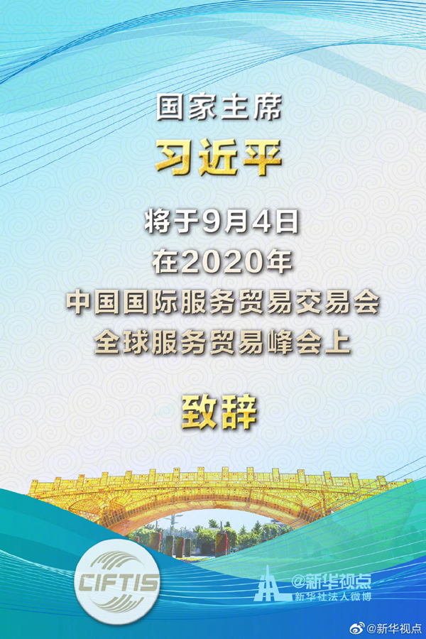 新華社北京9月3日電 外交部發(fā)言人華春瑩3日宣布:2020年中國國際服務(wù)貿(mào)易交易會全球服務(wù)貿(mào)易峰會將于9月4日在北京舉行。國家主席習(xí)近平將在峰會上致辭。