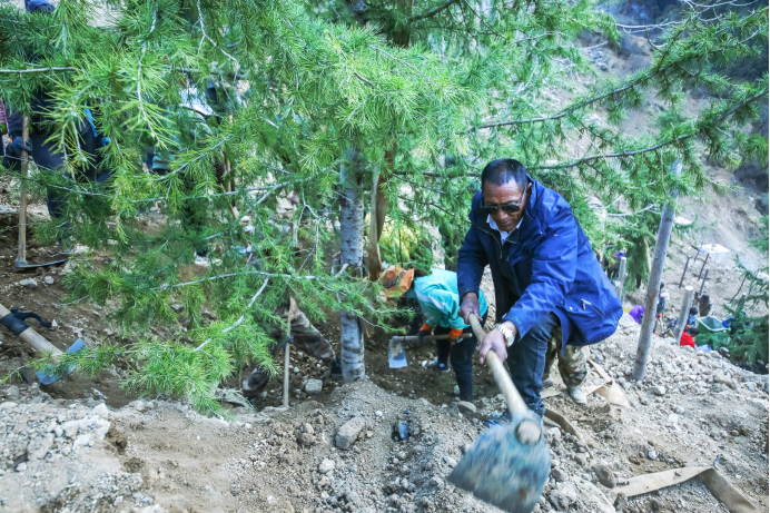 新冠肺炎疫情期間,巴拉格宗景區(qū)關(guān)閉,斯那定珠投入2000多萬(wàn)購(gòu)置了4萬(wàn)多棵樹苗,帶領(lǐng)200多個(gè)員工在景區(qū)植樹。 索朗農(nóng)布/攝