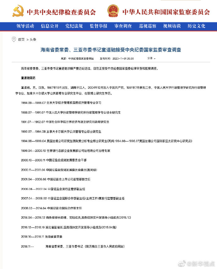 海南省委常委、三亞市委書記童道馳涉嫌嚴重違紀違法,目前正接受中央紀委國家監(jiān)委紀律審查和監(jiān)察調(diào)查。