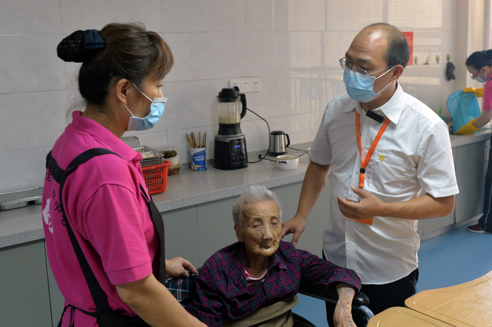 老年人能力評估師王帝權(quán)(右)在和護(hù)理人員交流老人的飲食狀況 新華社記者 戚曉毅 攝