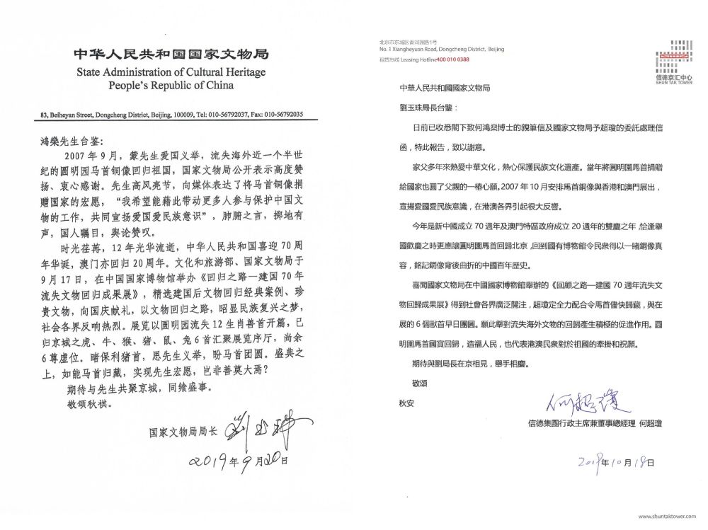 2019年11月,為慶祝中華人民共和國成立70周年和澳門回歸20周年,在國家文物局積極溝通協(xié)調下,何鴻燊先生決定將圓明園馬首銅像正式捐贈國家文物局。
