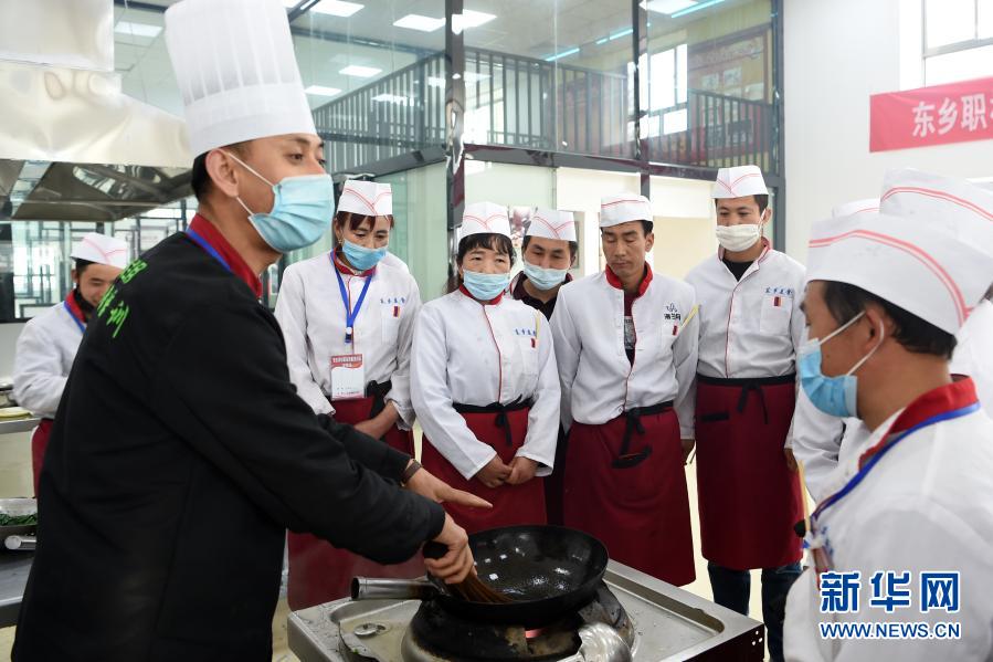 東鄉(xiāng)縣職業(yè)技術(shù)學(xué)校中式烹飪培訓(xùn)班學(xué)員在上實操課(4月21日攝)。新華社記者 范培珅 攝