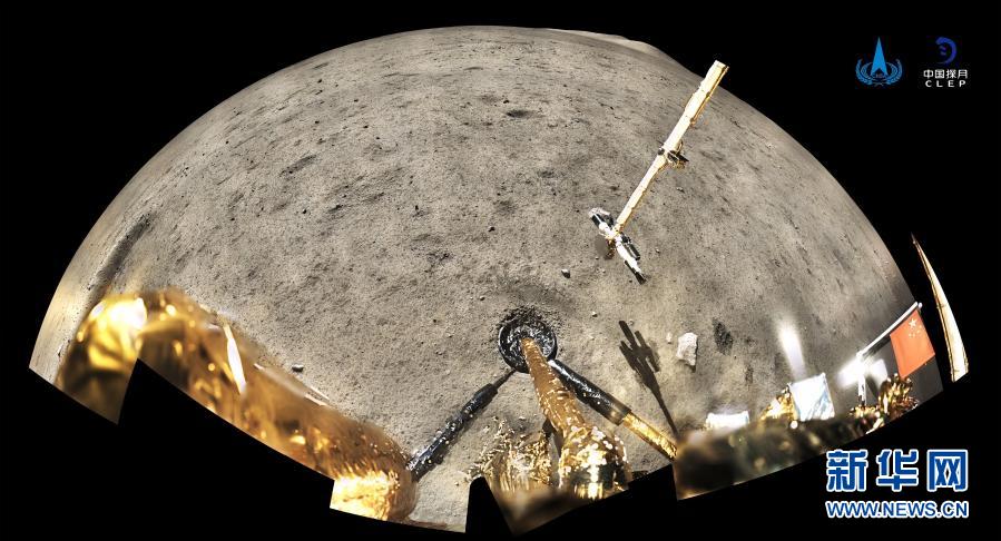 嫦娥五號(hào)著陸器和上升器組合體全景相機(jī)環(huán)拍成像,五星紅旗在月面成功展開,此外圖像上方可見已完成表取采樣的機(jī)械臂及采樣器。新華社發(fā)(國(guó)家航天局供圖)