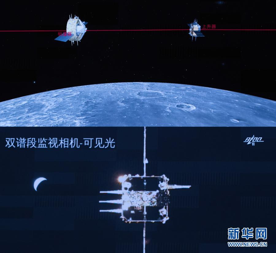 這是12月6日在北京航天飛行控制中心指揮大廳拍攝的嫦娥五號上升器與軌道器返回器組合體交會對接畫面。