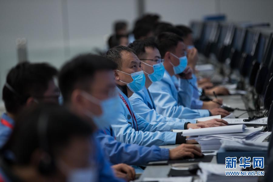 12月6日,航天科技人員在北京航天飛行控制中心指揮大廳監(jiān)測嫦娥五號上升器與軌道器返回器組合體交會對接情況。