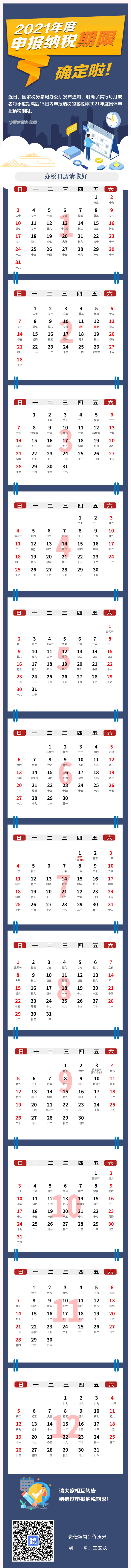近日,國家稅務總局辦公廳發(fā)布《關(guān)于明確2021年度申報納稅期限的通知》(稅總辦函〔2020〕242號),明確實行每月或者每季度期滿后15日內(nèi)申報納稅的各稅種2021年度具體申報納稅期限。為了方便納稅人每月查找辦稅日期,一張動圖送給你!快收藏起來吧~