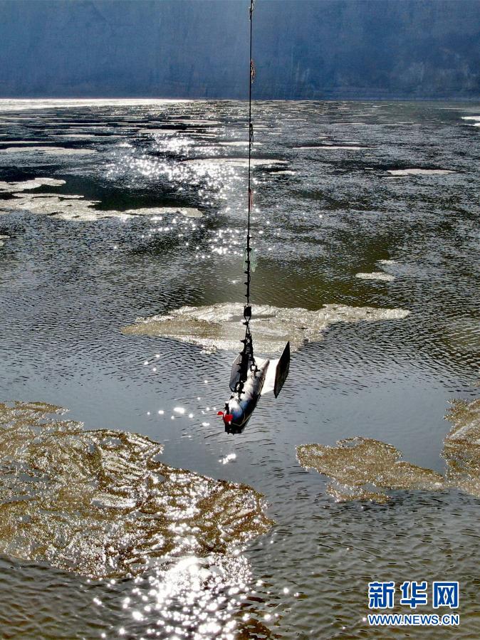 龍門水文站工作人員利用鉛魚纜道進(jìn)行流量測驗(yàn)(12月27日攝,無人機(jī)照片)。新華社記者 劉詩平 攝