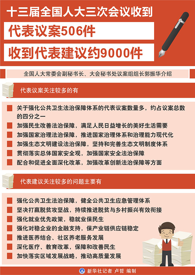 新華社北京5月26日電 記者26日從十三屆全國人大三次會議秘書處獲悉,到大會主席團(tuán)決定的代表提出議案截止時間5月25日12時,大會秘書處共收到代表提出的議案506件。同時,收到代表建議約9000件。
