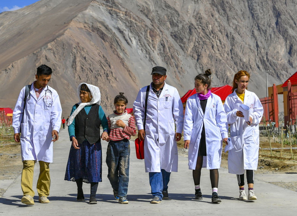 新疆塔什庫爾干塔吉克自治縣達布達爾鄉(xiāng)熱斯喀木村村醫(yī)發(fā)爾亞特·塔西白克(右三)與醫(yī)務(wù)人員來到當(dāng)?shù)匾椎胤鲐毎徇w安置點出診(2019年7月7日攝)。新華社記者 胡虎虎 攝