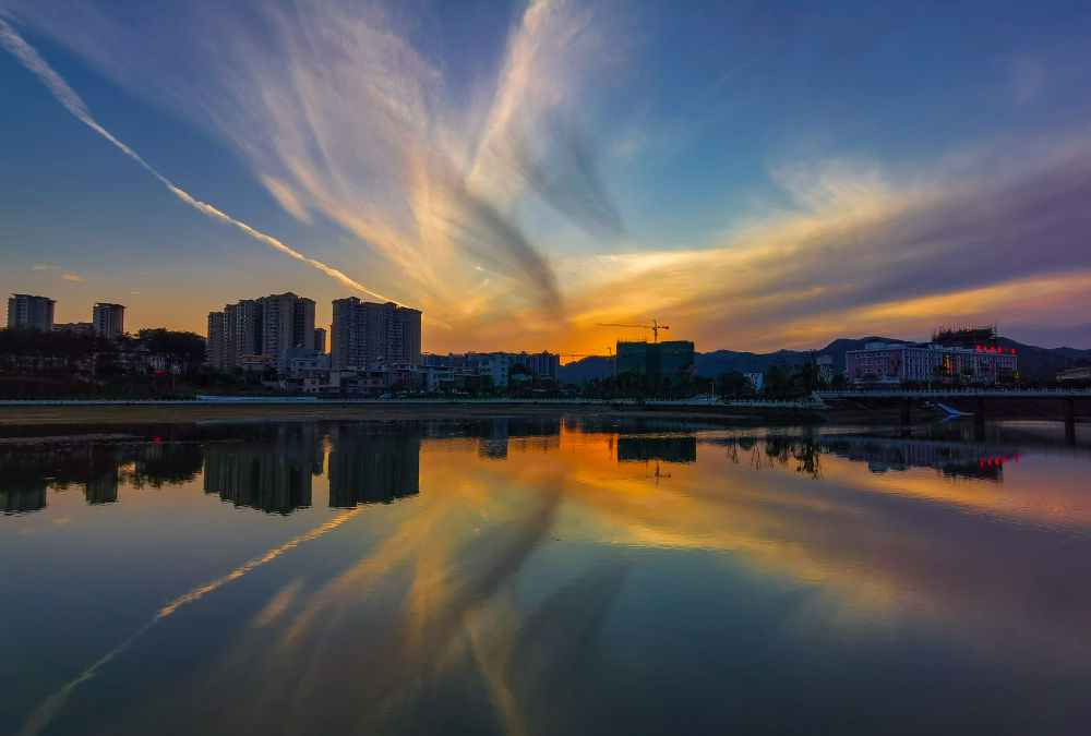 ?晚霞倒映在流經(jīng)翁源縣城的滃江(4月27日攝)。新華社記者 劉大偉 攝