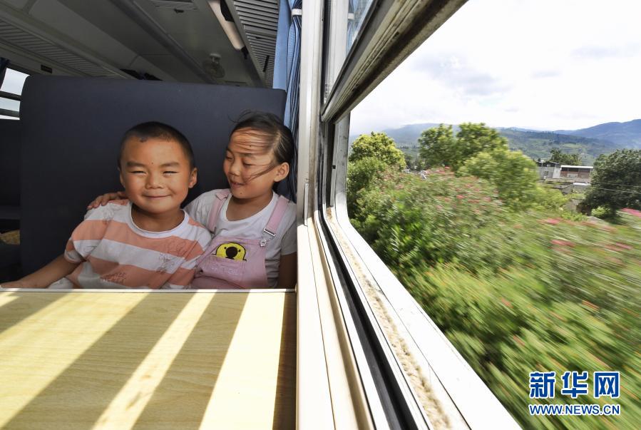 2020年8月14日,吳思語(yǔ)(右)帶著弟弟吳思遠(yuǎn)乘坐“小慢車”前往西昌走親戚。穿越四川涼山彝族自治州往返于普雄和攀枝花之間的5633/5634次列車,全列13節(jié)車廂,走滿全程353公里需要9個(gè)多小時(shí)。慢悠悠的火車沿途要???6個(gè)站,如同一座流動(dòng)的村莊,盡自己最大能力解決沿途百姓出行問題。