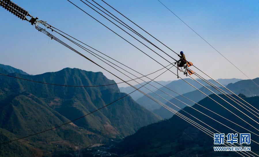 2020年5月3日,施工方國網(wǎng)四川電力送變電建設(shè)有限公司的員工在秦嶺之巔的高空緊線(無人機(jī)照片)。