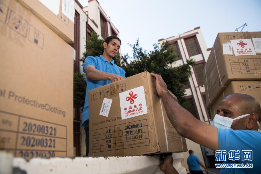 2020年5月10日,在埃及首都開羅,工作人員搬運中國政府援助的抗疫物資。新華社記者 鄔惠我 攝