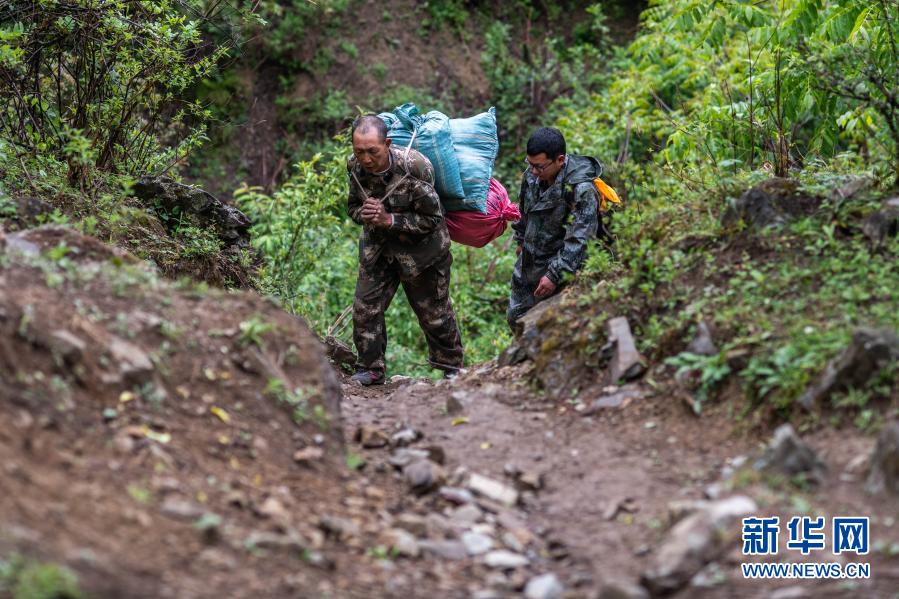 在云南省迪慶藏族自治州香格里拉滇金絲猴國家公園,護(hù)猴員余小德(左)背著喂滇金絲猴的食物上山(2020年5月23日攝)。新華社記者 胡超 攝