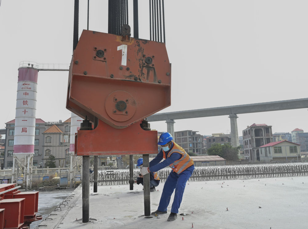1月28日,在位于福建省莆田市的中鐵十一局新建福廈鐵路4標(biāo)靈川制梁場(chǎng),河南籍提梁班工人杜學(xué)剛在配合進(jìn)行提梁作業(yè)。