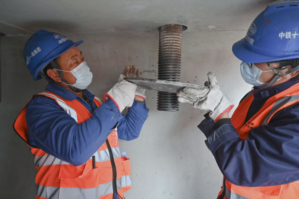 1月28日,杜學(xué)剛(前)和工友在進(jìn)行提梁前對(duì)孔作業(yè)。