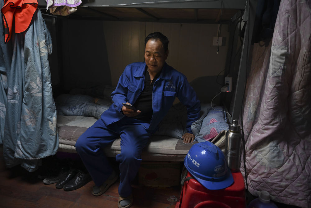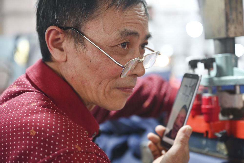 1月25日,在福建省福州市閩侯縣的億格戶外用品有限公司生產(chǎn)車(chē)間,四川籍計(jì)件工人張良國(guó)在休息時(shí)與大兒子視頻通話。