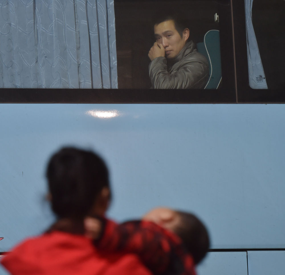 2018年2月2日凌晨,黃海龍登上回四川老家的長(zhǎng)途車(chē),看到聰聰哭鬧著不要爸爸走,用手擦著眼淚(資料照片)。