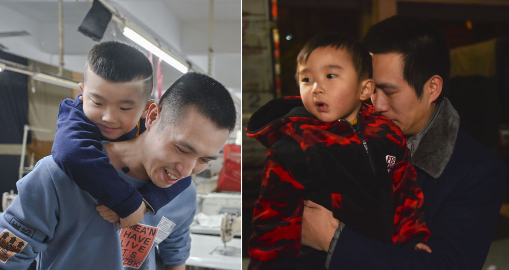 左圖為2021年1月26日,在福建省石獅市的金利萊斯服裝廠,聰聰和黃海龍?jiān)谝黄?;右圖為2018年2月2日凌晨,黃海龍即將登上返回四川的長(zhǎng)途車(chē),在上車(chē)前抱著不滿3歲的聰聰難舍難分。