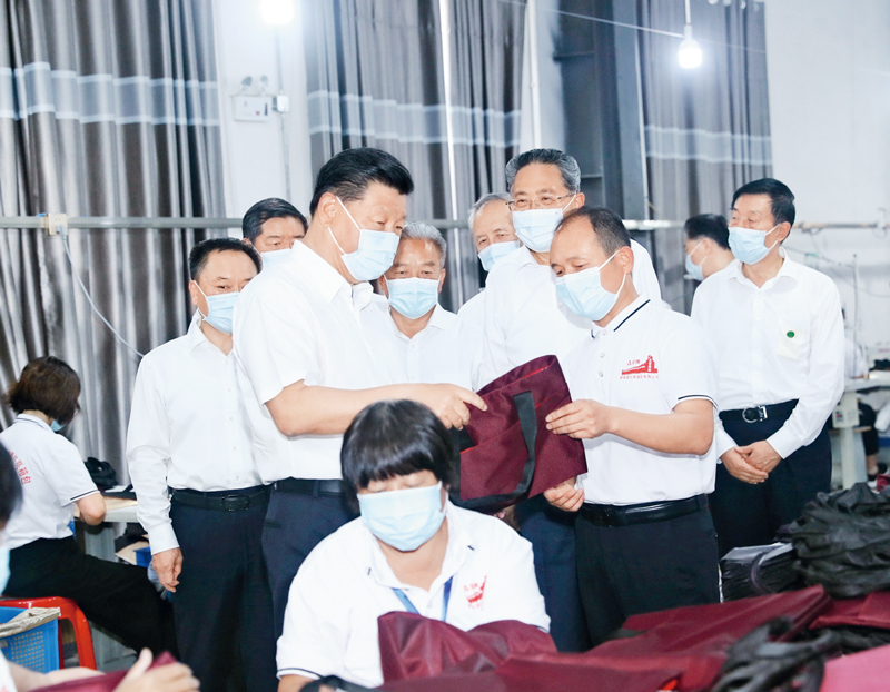 2020年8月18日至21日,中共中央總書記、國(guó)家主席、中央軍委主席習(xí)近平在安徽省考察。這是18日下午,習(xí)近平在阜陽(yáng)市阜南縣紅亮箱包有限公司察看車間生產(chǎn)線,了解企業(yè)災(zāi)后恢復(fù)生產(chǎn)和受災(zāi)群眾、貧困群眾就業(yè)情況。 新華社記者 鞠鵬/攝