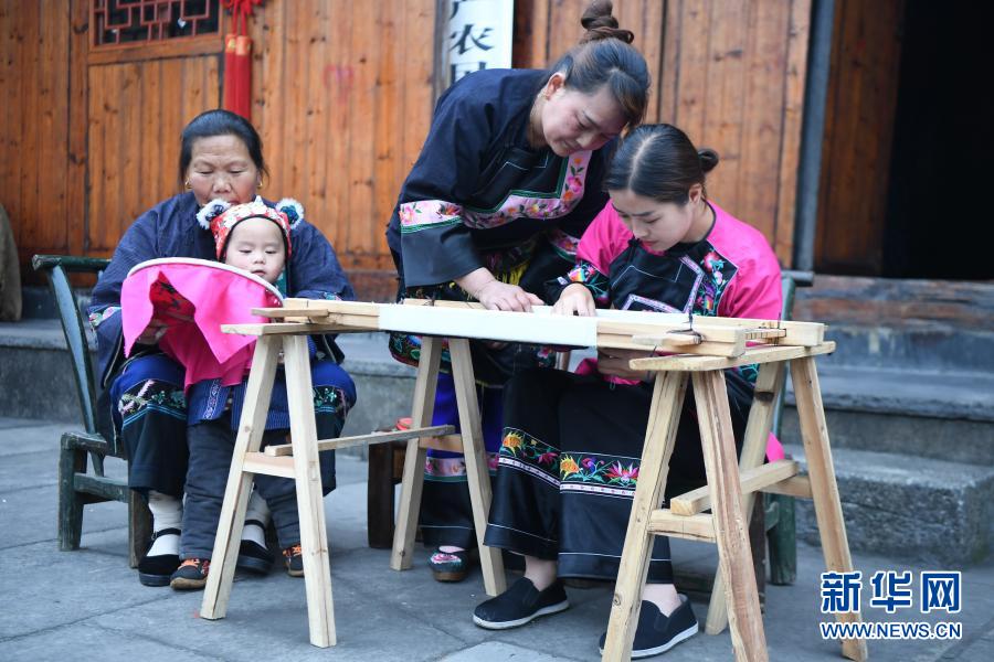 施林嬌(右一)在十八洞村學(xué)習(xí)苗繡(2020年4月25日攝)。新華社記者 薛宇舸 攝