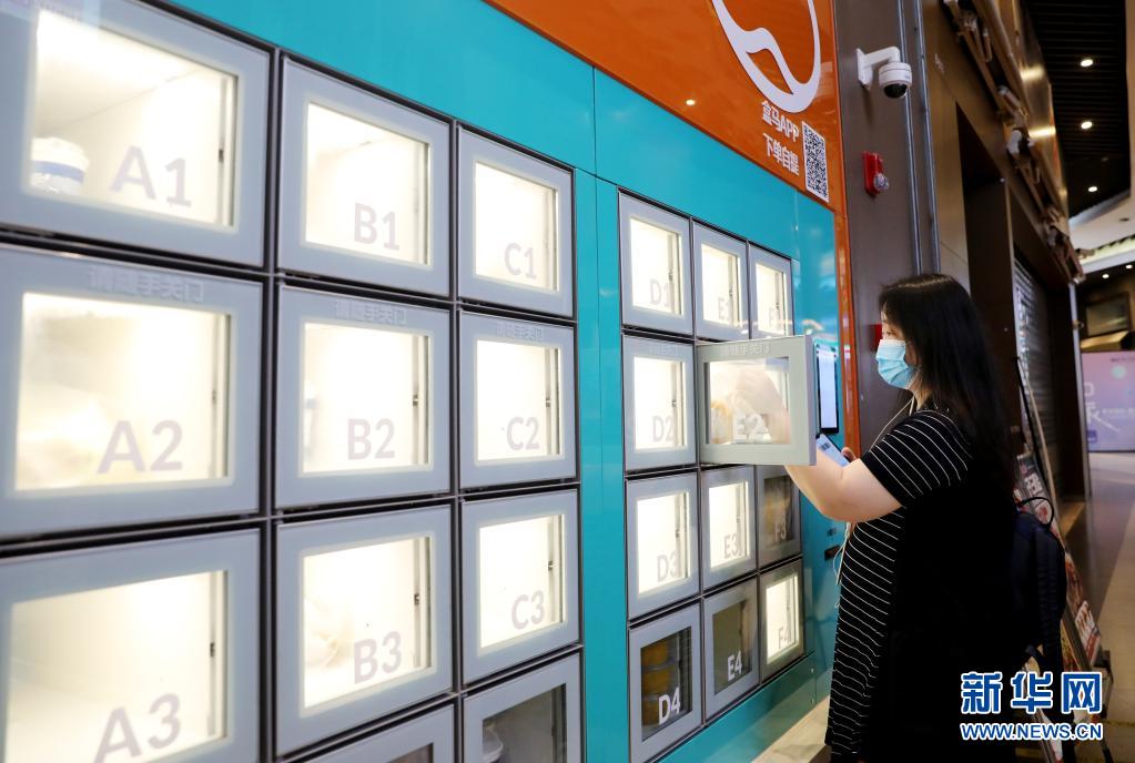 一位顧客通過APP掃碼,在上海地鐵13號線世博會博物館地鐵站附近的一家盒小馬服務(wù)點(diǎn)取餐柜中拿取預(yù)定的早餐(2020年7月17日攝)。新華社記者 方喆 攝