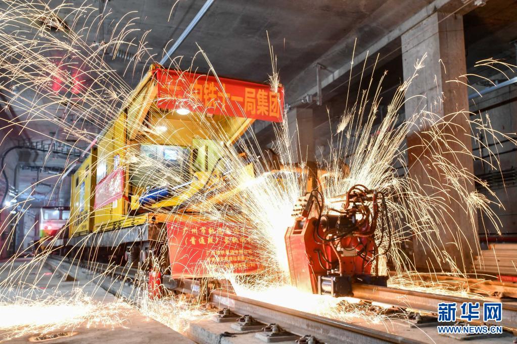 中鐵十一局軌道焊機在焊接廣州地鐵18號線首通段最后一個鋼軌接頭(2021年4月20日攝)。新華社記者 劉大偉 攝