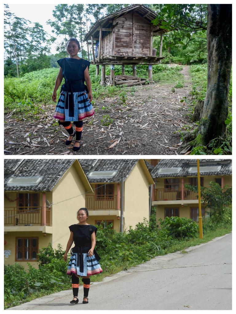 拼版照片:上圖為貴州黔南布依族苗族自治州荔波縣瑤山瑤族鄉(xiāng)村民謝三英從舊居的小路旁經(jīng)過,下圖為謝三英從瑤山瑤族鄉(xiāng)拉片移民新村的公路旁經(jīng)過(2017年8月8日攝)。新華社記者歐東衢攝