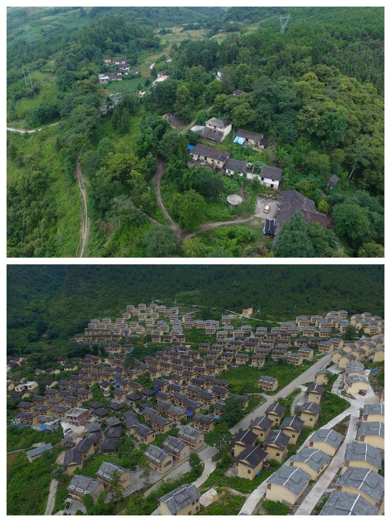 拼版照片:上圖為貴州省荔波縣瑤山瑤族鄉(xiāng)村民此前居住的拉片村林場組全景,下圖為瑤山瑤族鄉(xiāng)拉片移民新村全景(2017年8月8日攝)。新華社記者歐東衢攝
