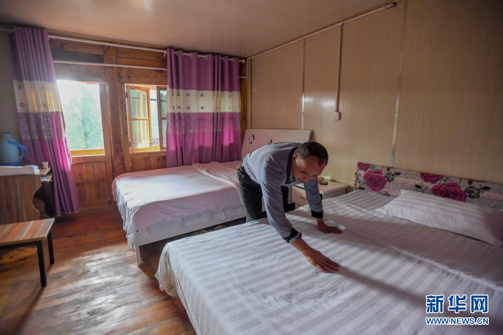 湖南省湘西土家族苗族自治州花垣縣十八洞村村民楊秀富在整理自家民宿(2019年9月3日攝)。新華社記者 陳澤國 攝