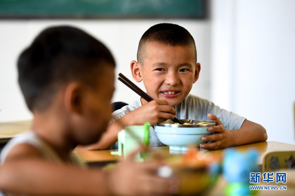 湖南省湘西土家族苗族自治州花垣縣十八洞小學(xué)的學(xué)生在教室吃午飯(2019年9月5日攝)。新華社記者 陳澤國 攝