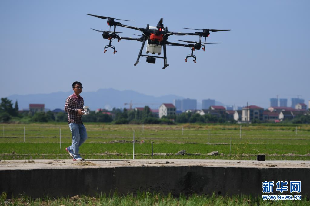 工作人員在湖南省益陽市赫山區(qū)米香村的稻田旁操控?zé)o人機(jī)給晚稻打藥(2020年7月23日攝)。新華社記者 薛宇舸 攝