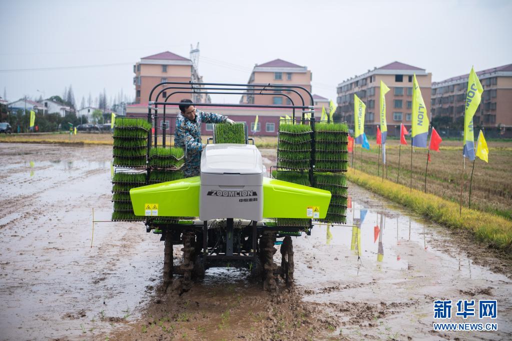 在湖南省益陽市沅江市草尾鎮(zhèn)沅江現(xiàn)代農(nóng)業(yè)技術(shù)研發(fā)基地,工作人員演示插秧機(jī)操作(2021年3月2日攝)。新華社記者 陳思汗 攝