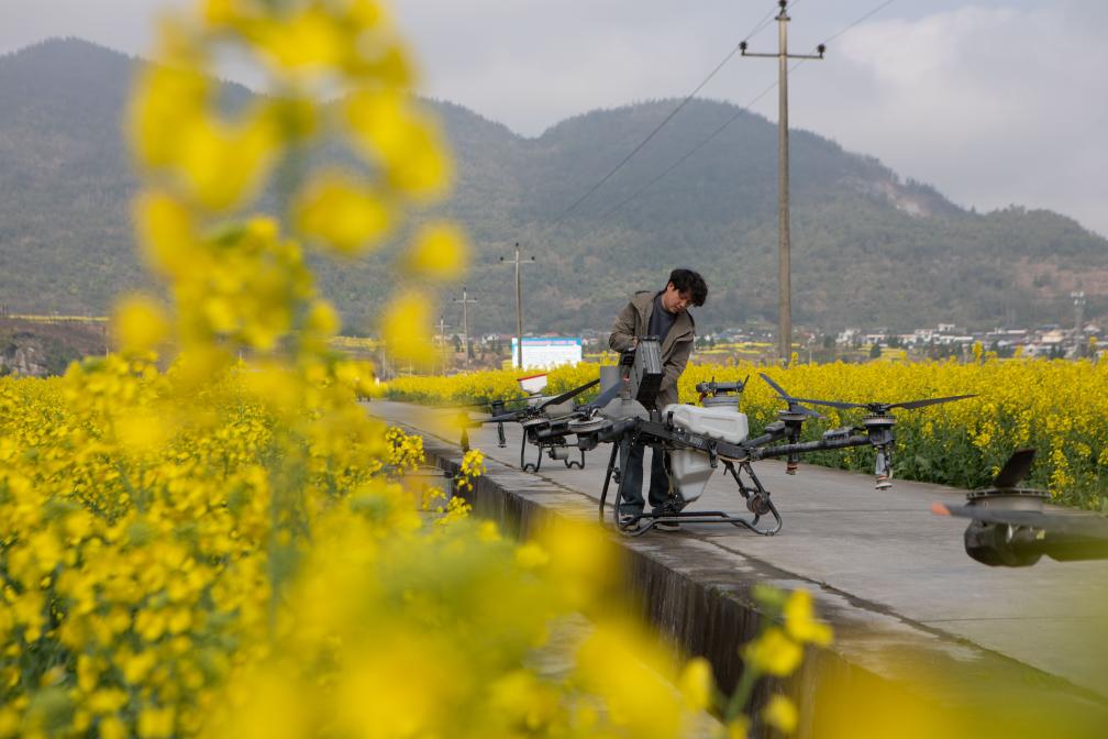 3月10日,在重庆市秀山土家族苗族自治县清溪场街道油菜种植基地,种植大户在给无人机安装电池,准备开展“一喷多促”田管作业。新华社发(胡程 摄)