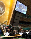 國(guó)東部時(shí)間5月20日下午,紐約曼哈頓,聯(lián)合國(guó)總部大會(huì)廳。一場(chǎng)中美軍樂團(tuán)聯(lián)合音樂會(huì)隆重舉行。首次走進(jìn)聯(lián)合國(guó)的中國(guó)人民解放軍軍樂團(tuán),演奏了《歌唱祖國(guó)》為音樂會(huì)“壓軸”。激昂的樂曲在這里回蕩,難忘的歷史在這里流淌……